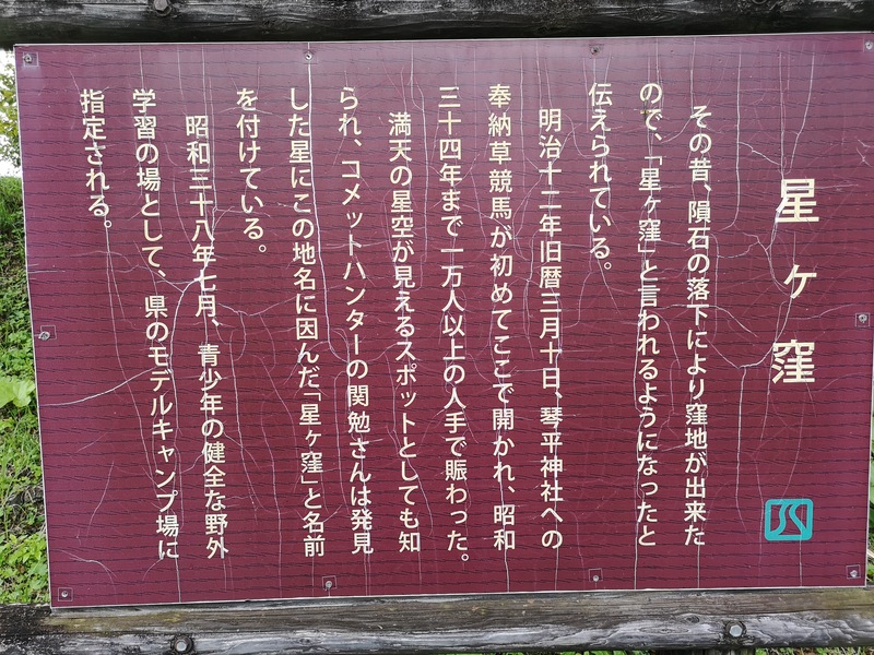 四国カルストにある宿舎『天狗荘』は高原にあるので星を観測するのに絶好の場所である。『星ヶ窪』も負けず劣らず満天の星が綺麗で人気のキャンプ場であるが、ここには流れ星の落ちた跡と言い伝えられる窪みがある。まさにその名の通り「星ヶ窪」。隕石等、宇宙からの物体の落下地点ならロシアシベリアのツングースカやメキシコユカタン半島のチュクシュループなどの大災害を連想してしまうが、こちらは窪地になり水が溜まって池となっているかわいらしい物。なんでも昔は競馬場があり1万人ほどの人手で賑わっていたらしい、こんな凄い山奥で。こっちの方がよほどミステリーである。