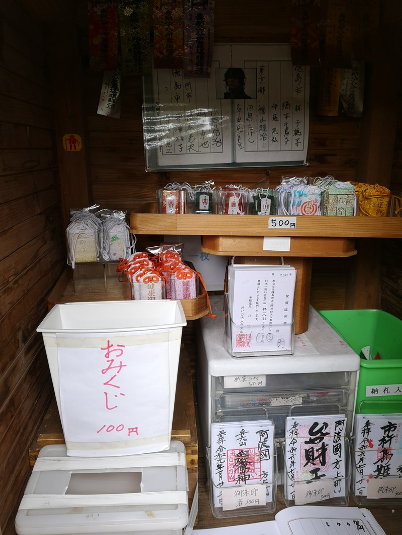 「祠の横ではセルフだけどきちんと「お守り」や「朱印」を売っている。「おみくじ」もあるぞ。」